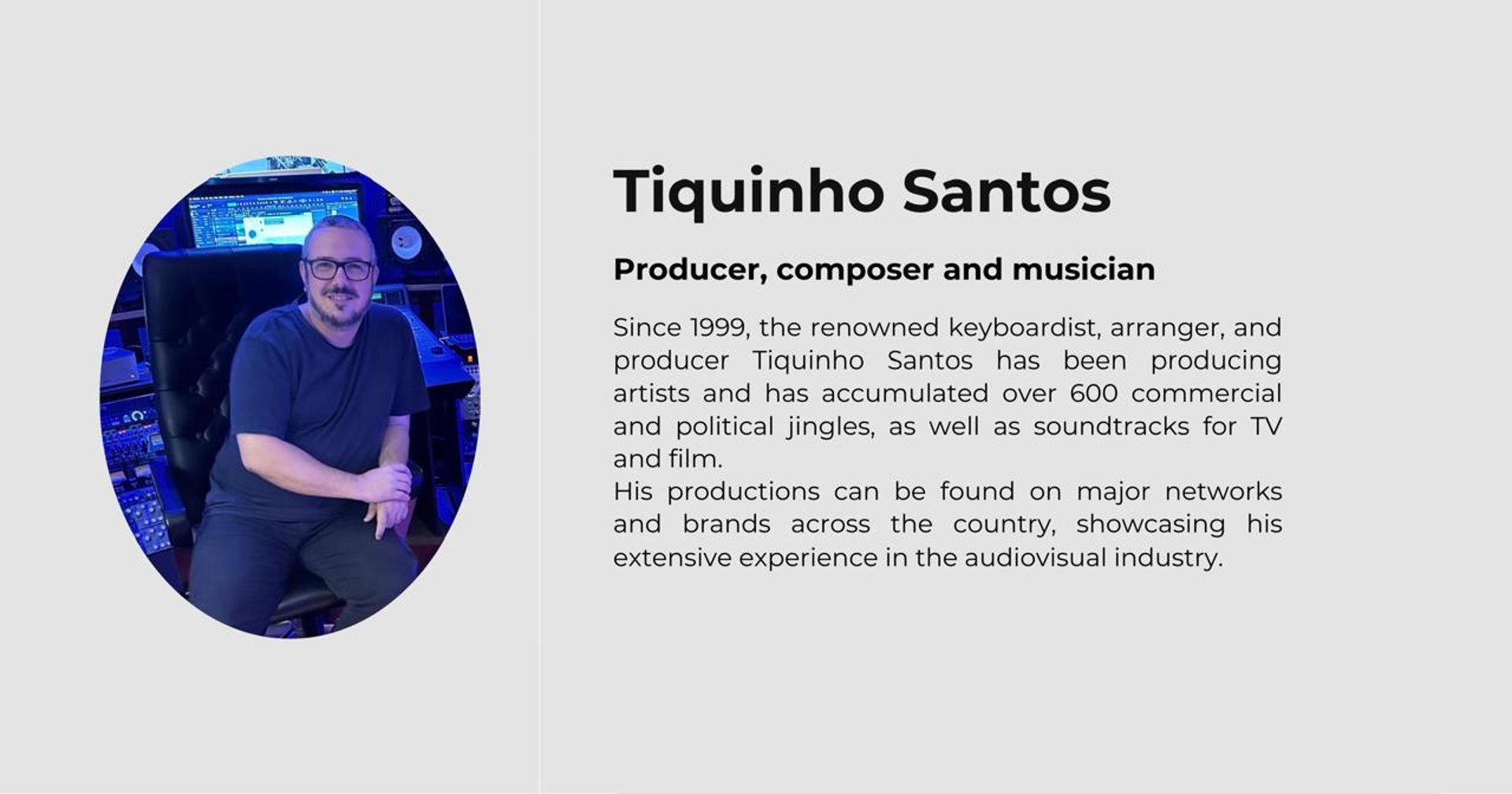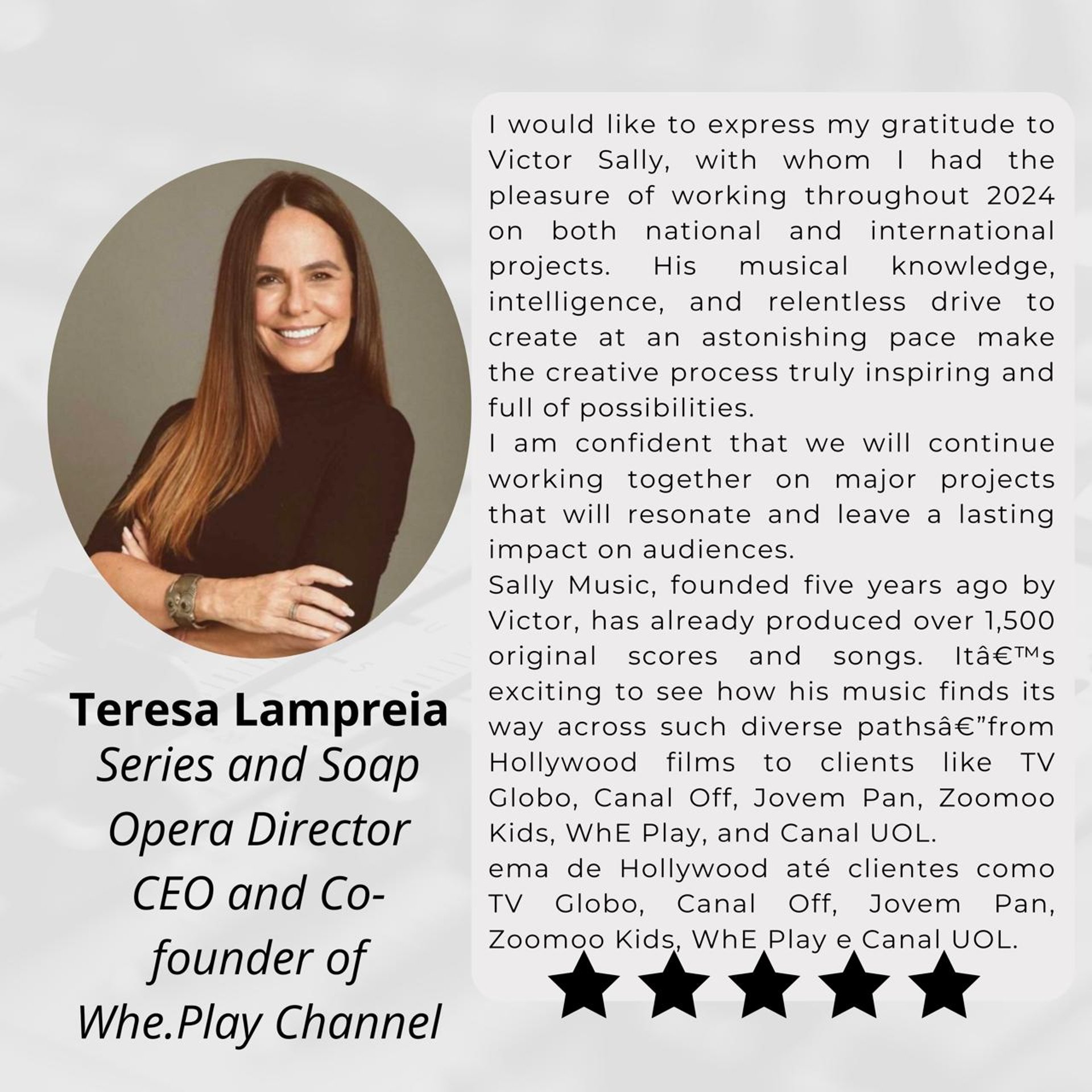Founded by producer, composer, and singer Victor Sally, the company has delivered thousands of high-quality productions, featured in more than 300 programs broadcast on major networks and platforms such as TV Globo, Canal Off, Jovem Pan, ZooMoo Kids, Whe Play, and Canal UOL, among others.
