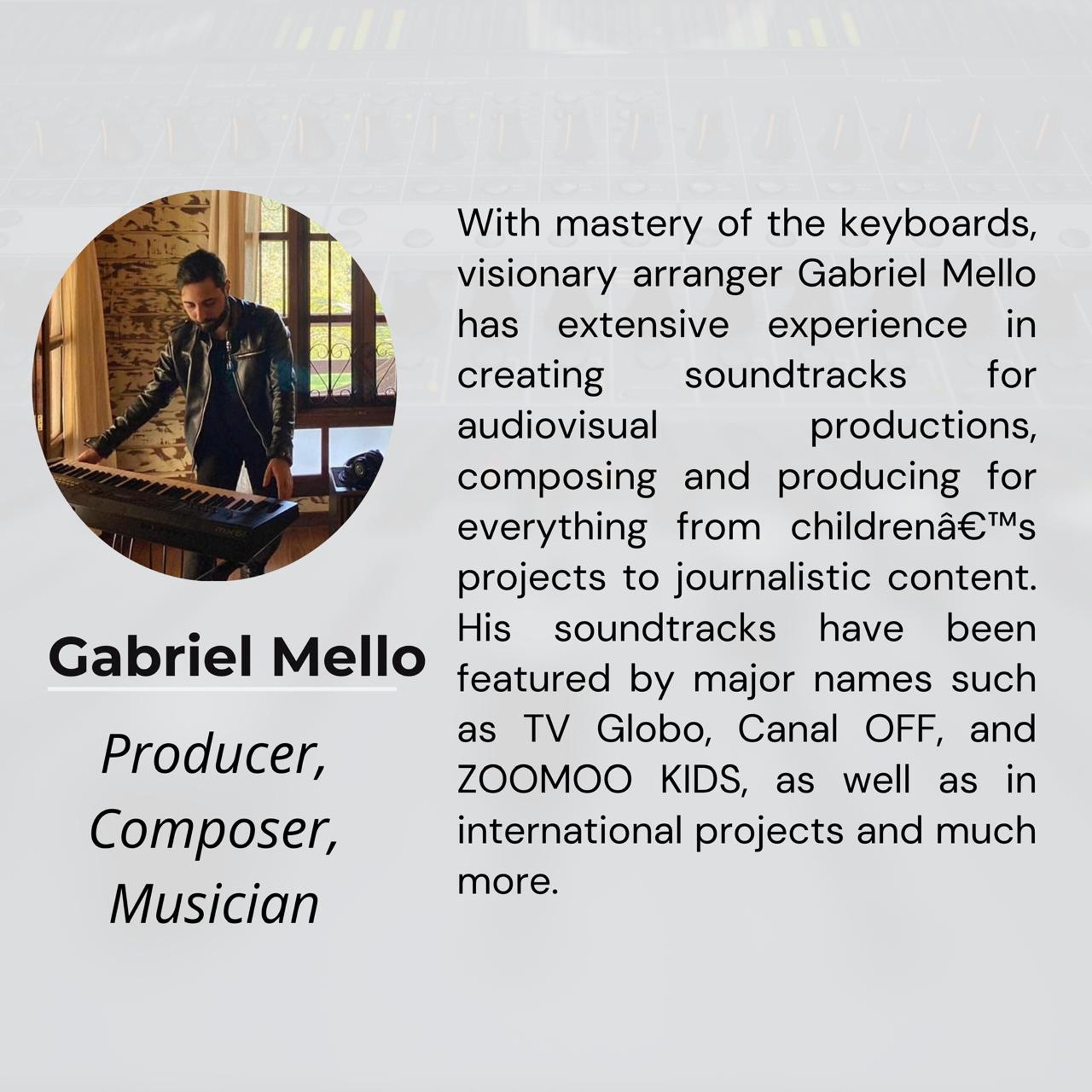 Our mission is to bring stories to life through sound, creating unique musical experiences that connect and move audiences. Constantly attuned to industry trends, we explore contemporary and innovative sounds aligned with current demands to deliver modern, authentic, and impactful soundtracks.