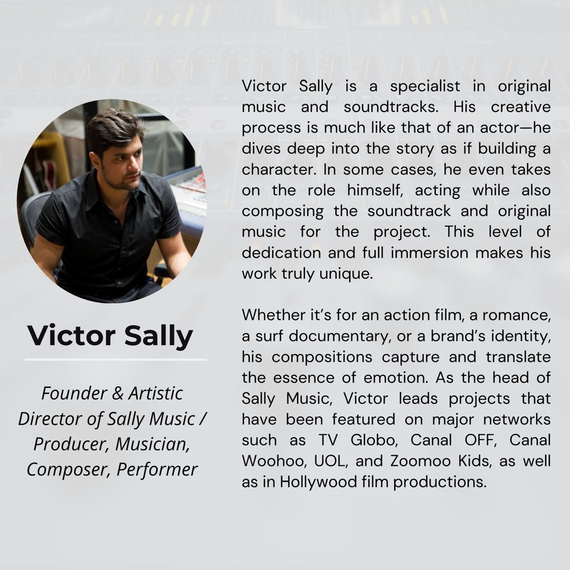 Founded six years ago by Victor, Sally Music has produced more than 1,500 original soundtracks and musical works. It is exciting to see how Victor’s music finds such diverse paths, from Hollywood cinema to clients such as TV Globo, Canal Off, Jovem Pan, ZooMoo Kids, WhE Play, and Canal UOL.