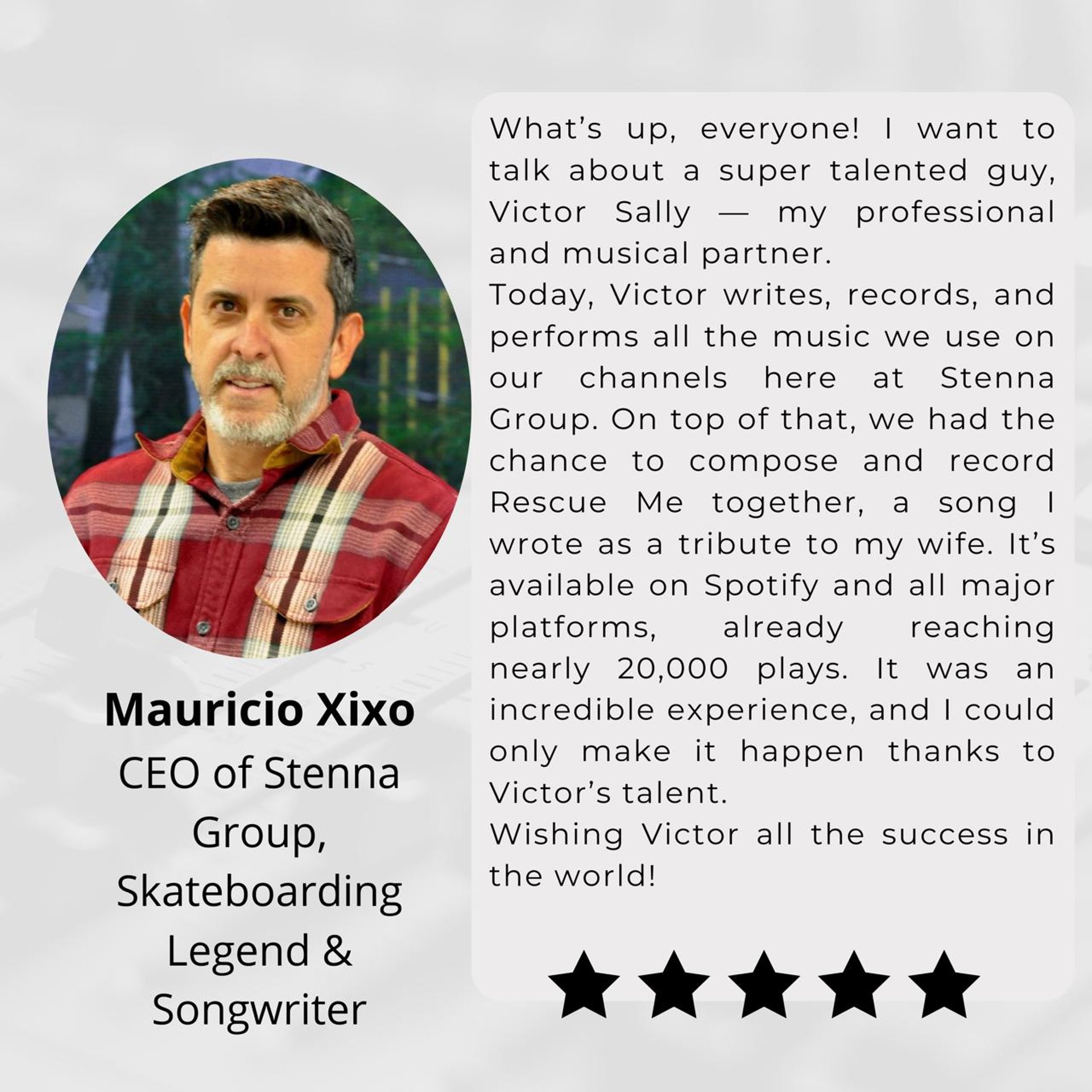 I would like to express my gratitude to Victor Sally, with whom I had the pleasure of working throughout 2024 on both national and international projects. His musical culture, intelligence, and tireless drive to produce at an impressive pace make the creative process deeply inspiring and full of possibilities.